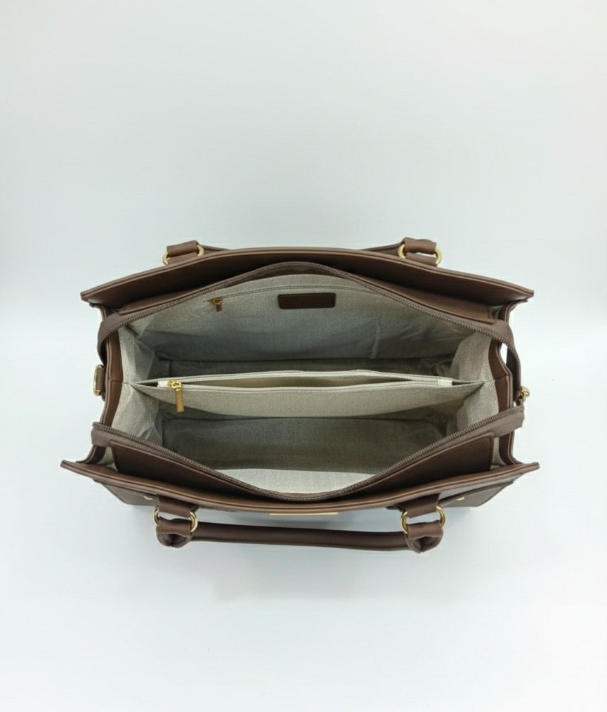 The Executive Tote: A spacious, structured handbag featuring tall rolled handles and gold-tone hardware accents. Perfect for your tablet, notebook, and daily essentials.