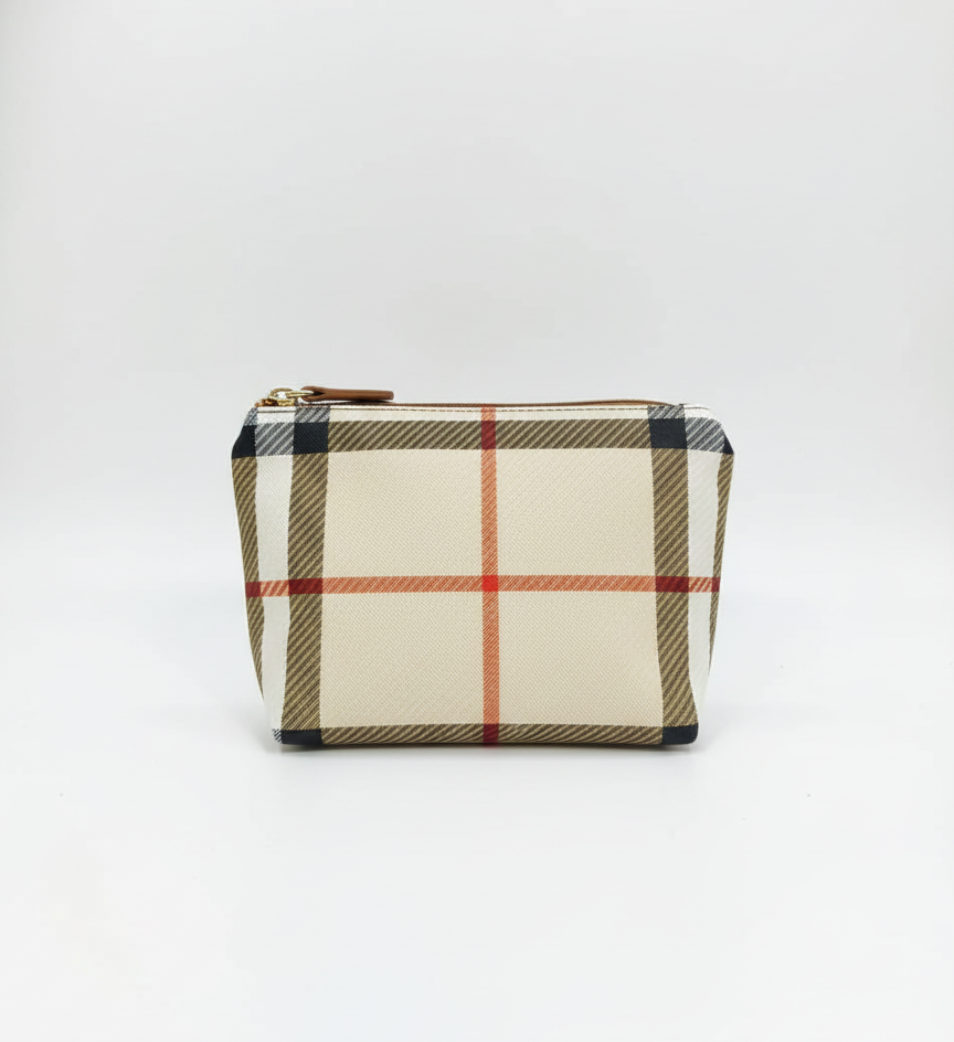 Iconic Design: A sophisticated neutral plaid print accented with rich tan faux-leather trim for a high-end aesthetic.