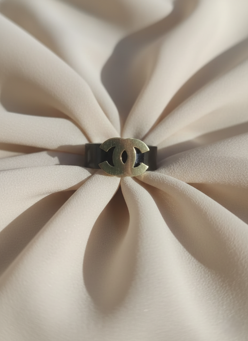 Finishes: Vintage gold-tone CC logo contrasting with a sleek, dark band (appears black or dark enamel/resin).