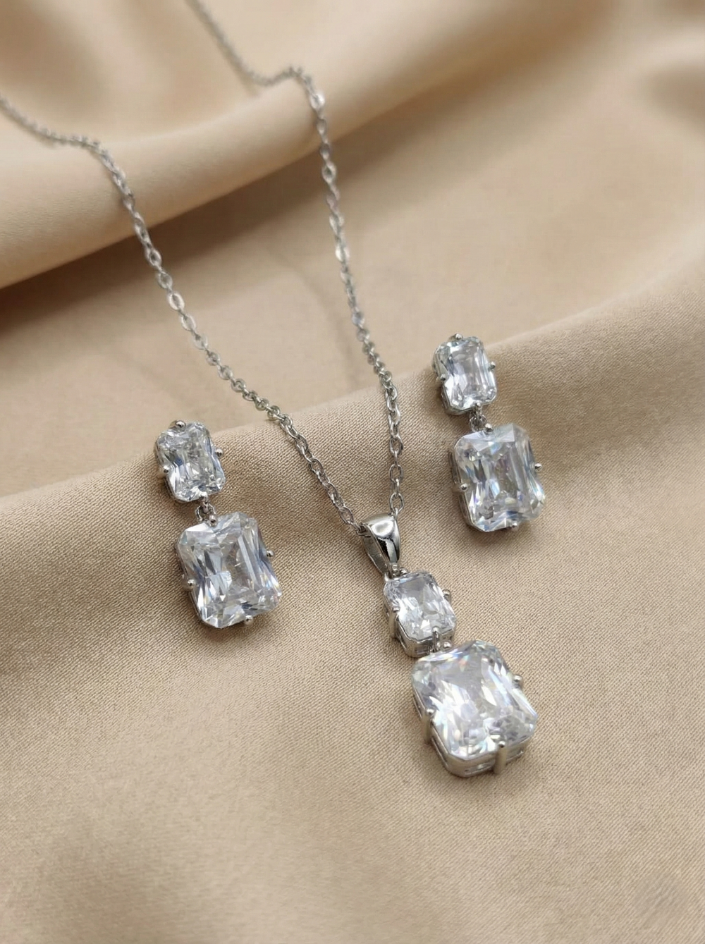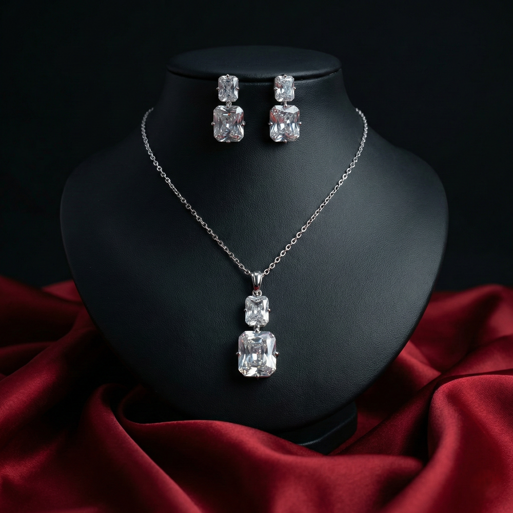 Elevate your everyday elegance with our Classic Emerald-Cut Pendant Set. This stunning silver-toned set features a sophisticated drop design, highlighting large, rectangular-cut American Diamond (AD) stones that capture the light from every angle.