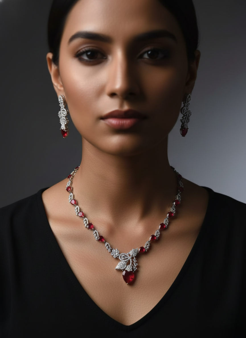 Elevate your evening ensemble with the NISA Crimson Radiance Set, a masterpiece of contemporary jewelry design. This exquisite set features a brilliant combination of pear-cut scarlet stones and meticulously pavé-set American Diamonds (AD), designed for the woman who loves to make a sophisticated statement.