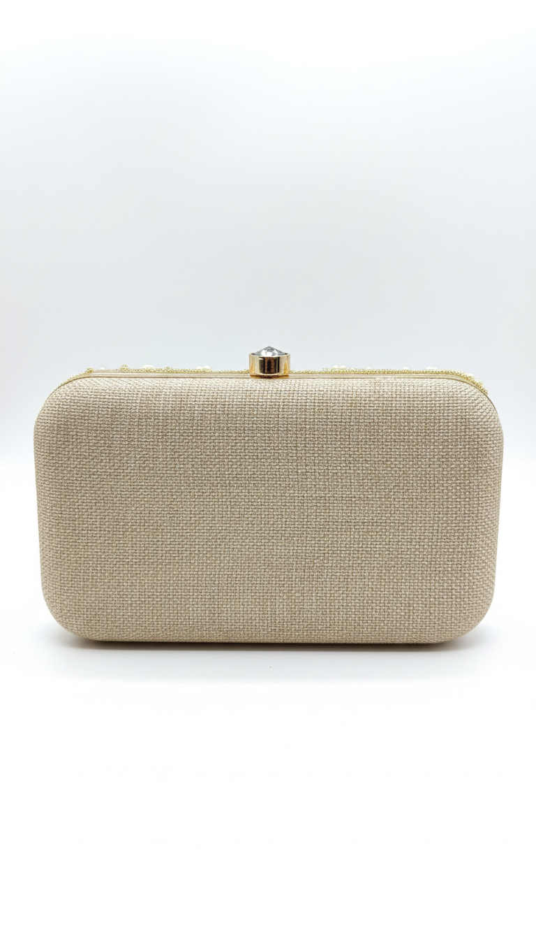 This luxurious gold box clutch is a masterpiece of intricate craftsmanship, featuring a dazzling central medallion design created from a blend of antique gold beads, crystals, and luminous faux pearls. The continuous, circular pattern gives this accessory a sophisticated, regal look perfect for the most formal and celebratory events. It comes complete with a stunning crystal clasp and two versatile detachable straps for carrying options.