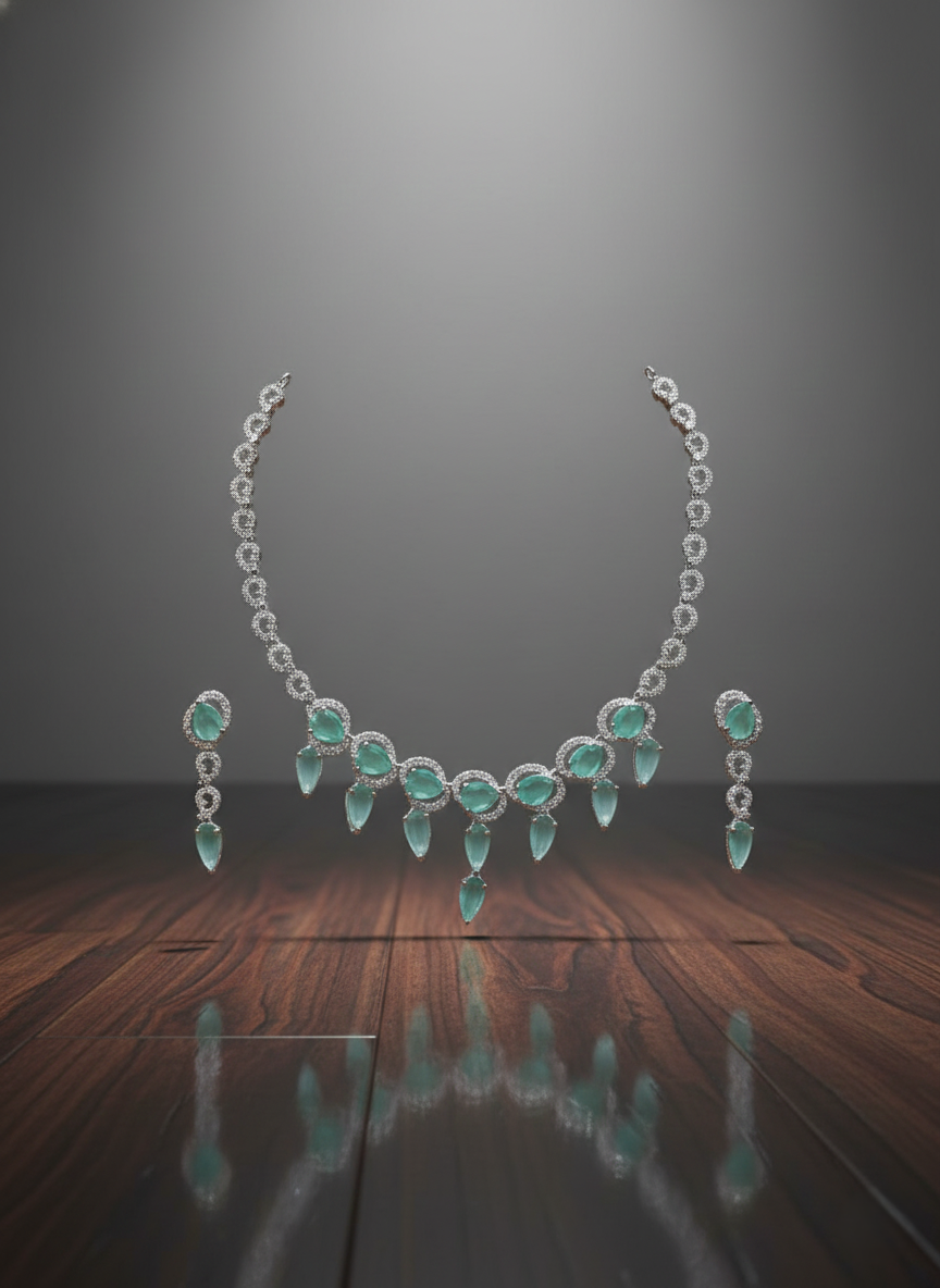 Elevate your jewelry collection with this exquisite Mint Green and Silver American Diamond (AD) set. Designed for the modern woman who appreciates classic elegance with a touch of contemporary color, this set features a breathtaking arrangement of seafoam green stones and brilliant-cut cubic zirconia.