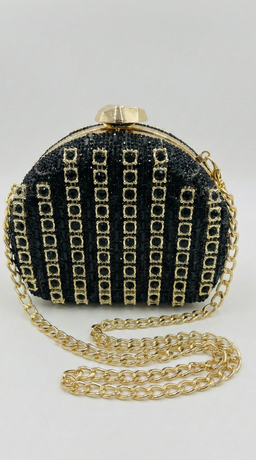 Meet your new favorite "plus one." This stunner isn't just a bag; it's jewelry for your outfit. Featuring rows of faceted black stones caged in gold, this clutch brings serious drama to any look.