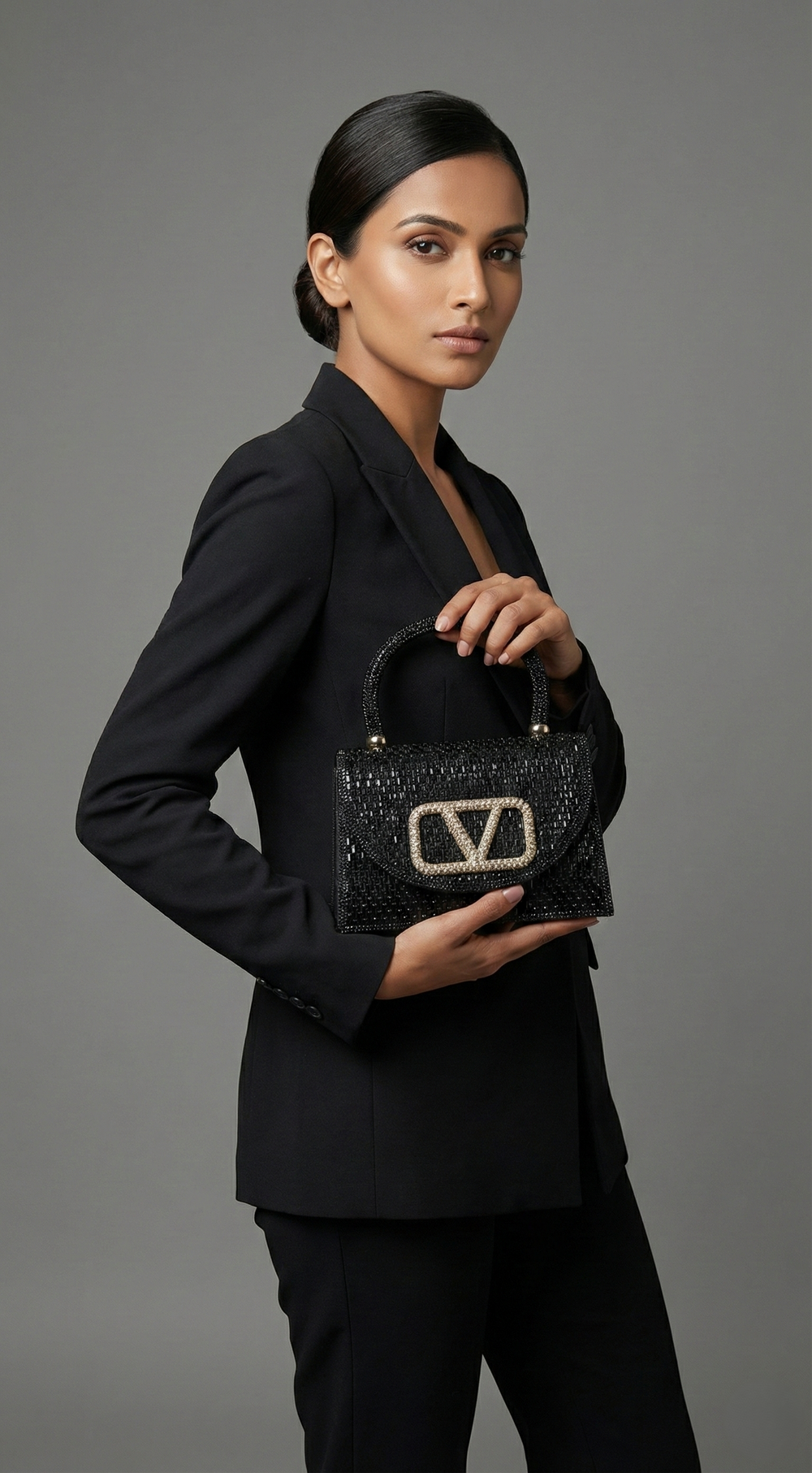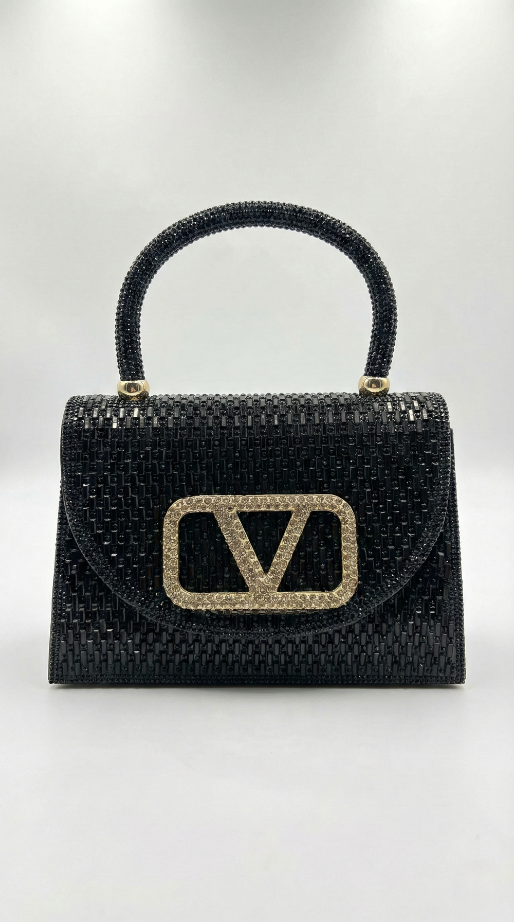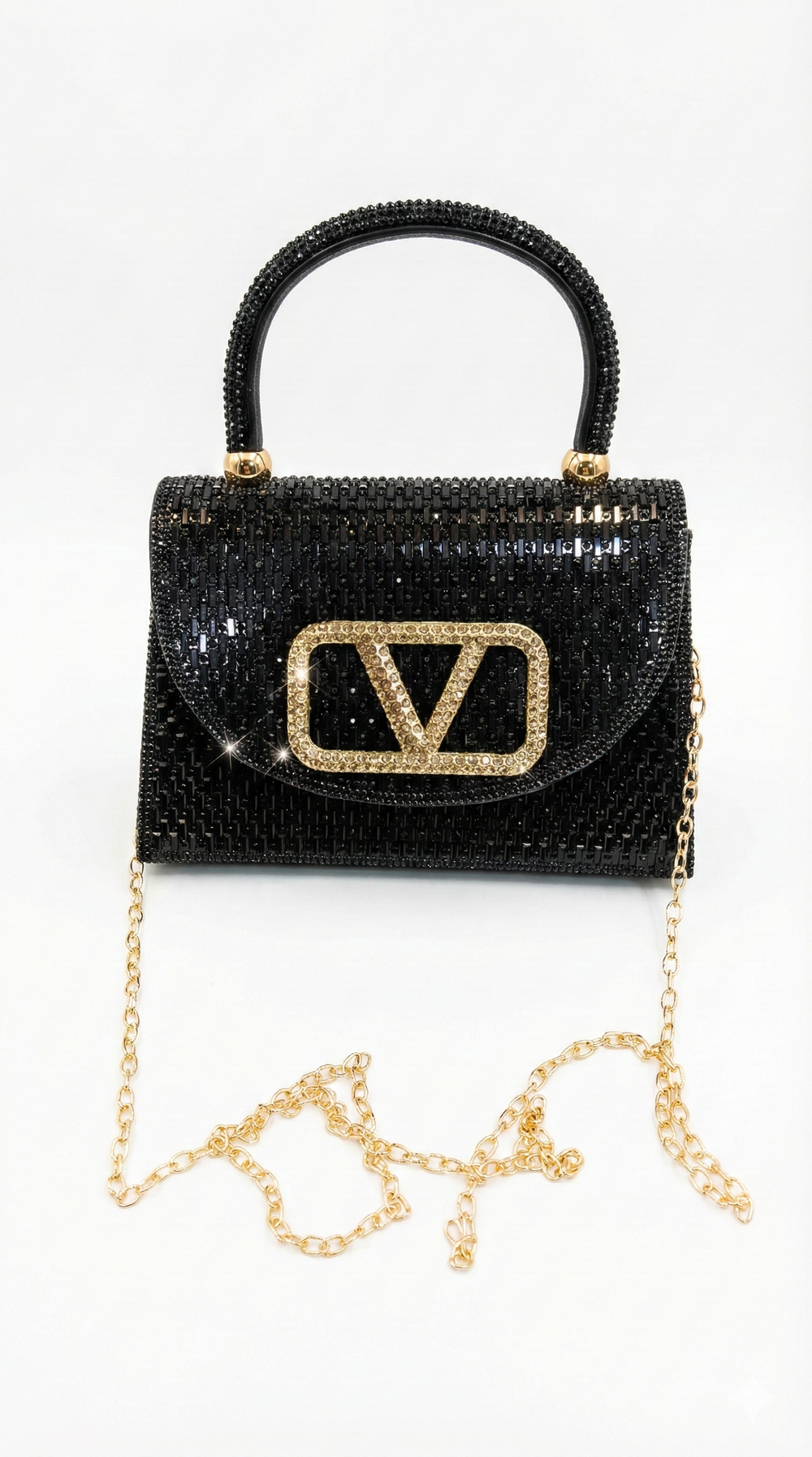 Elevate your evening attire with this breathtaking statement piece. Designed for the woman who loves to shine, the Midnight V-Emblem Bag is a masterclass in texture and glamour.