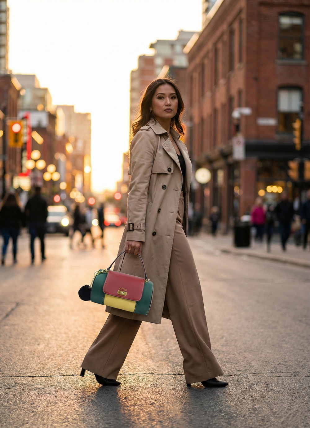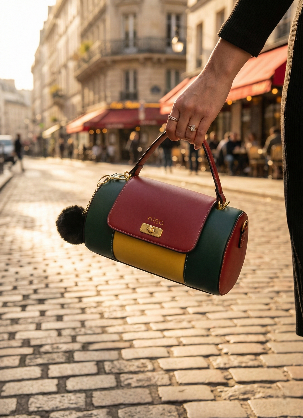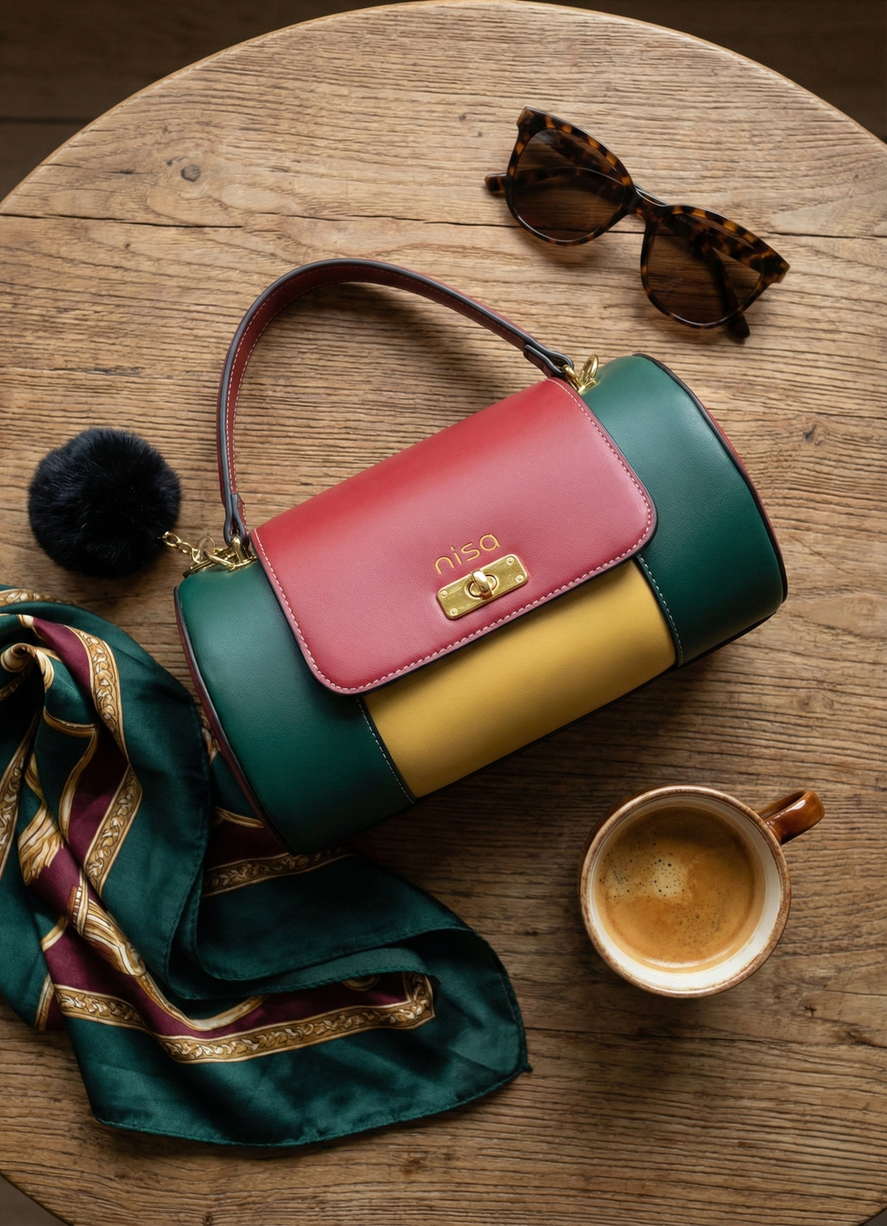 Make a bold statement with the Nisa Barrel Bag, a retro-inspired piece designed for the modern trendsetter. This structured handbag features a striking tri-color design, blending deep emerald green, vivid red, and sunny yellow for a look that pops against any outfit.