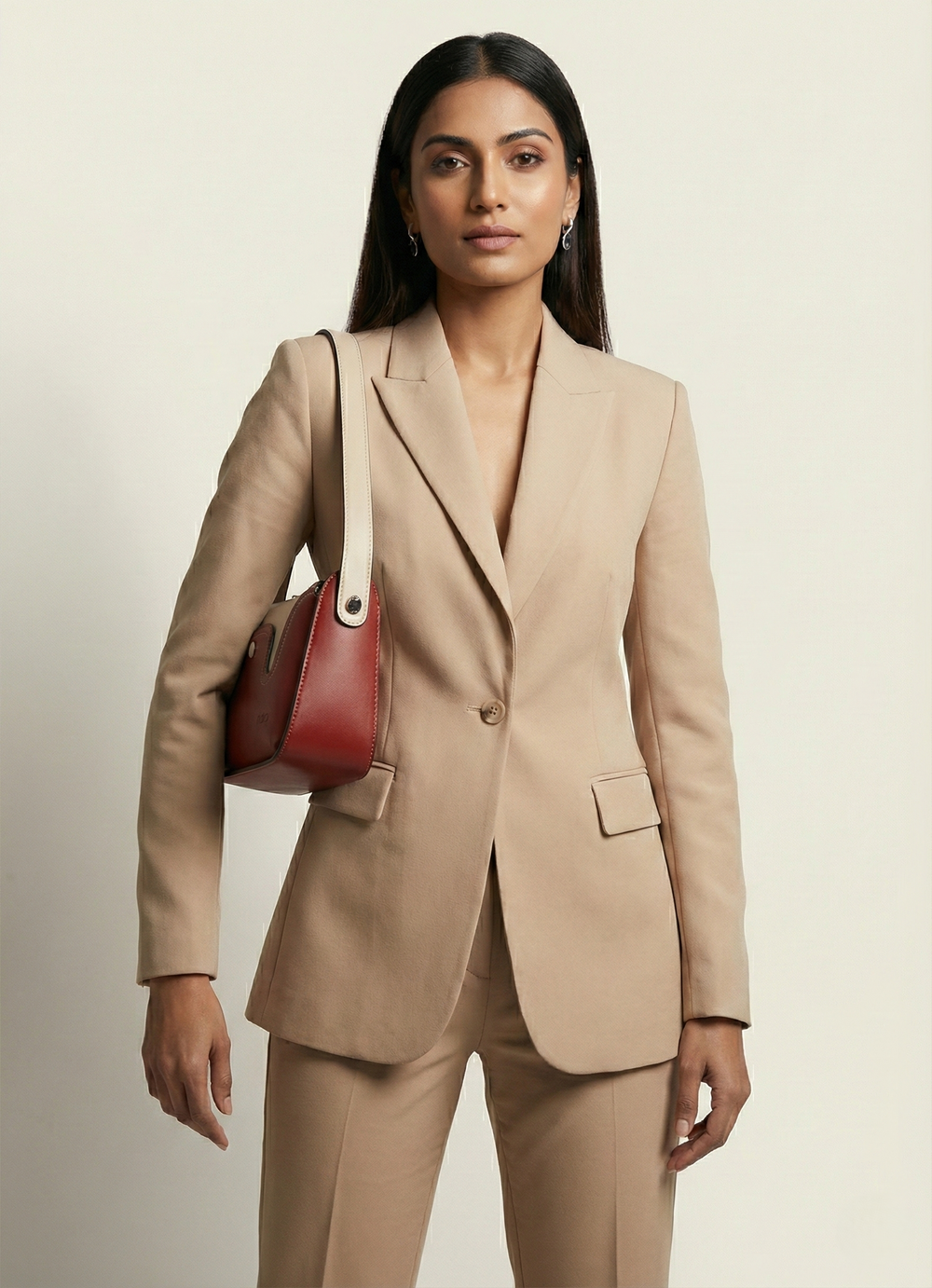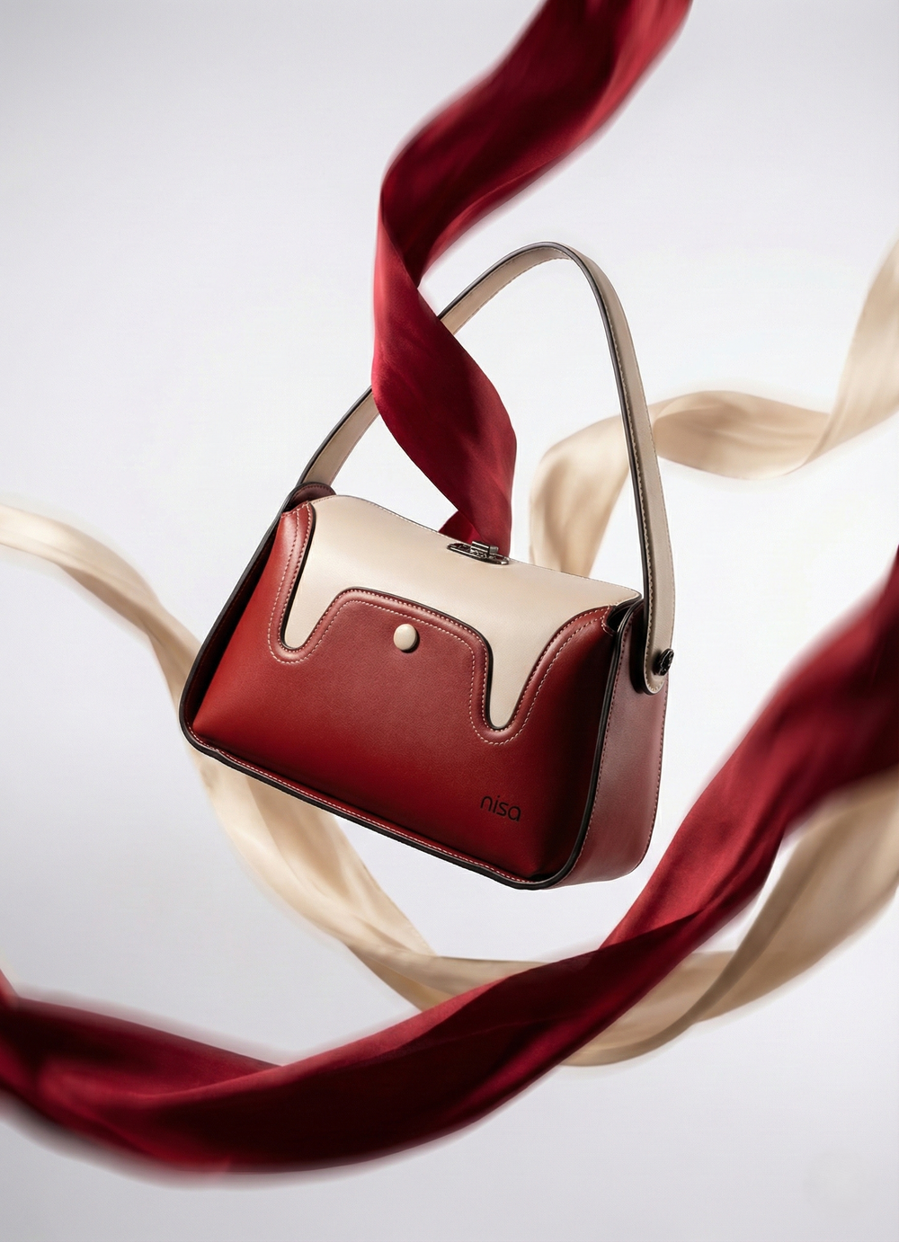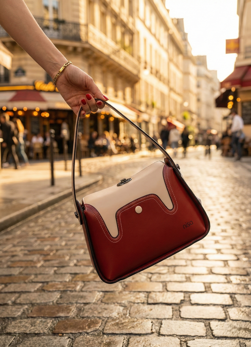Elevate your everyday style with this striking structured handbag by Nisa. Designed for the modern minimalist, this bag features a sophisticated color-block design, blending smooth cream vegan leather with a deep, rich terracotta body. The curved silhouette and contrast stitching add a touch of artisanal charm, while the secure top-clasp closure keeps your essentials safe.