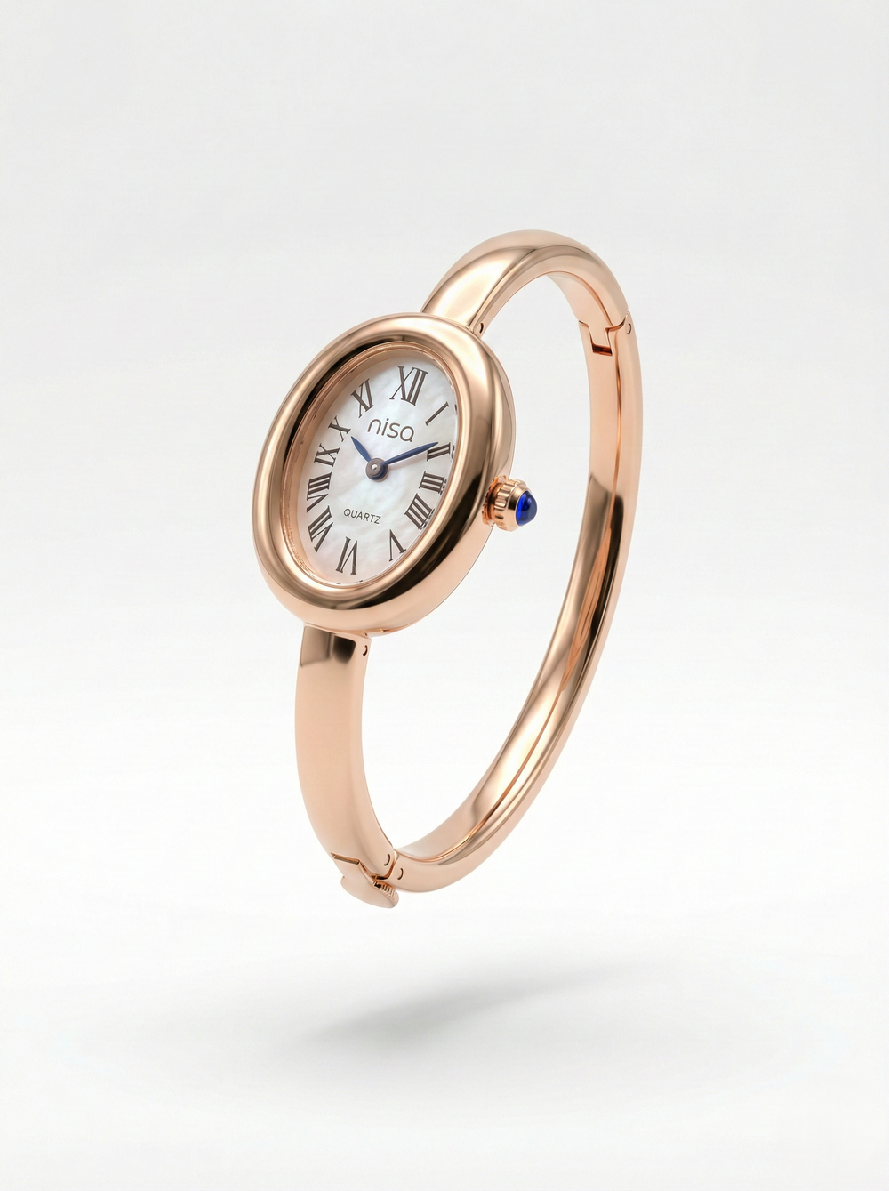Elevate your wristwear with the Nisa Ellipse. Designed for the woman who views her timepiece as a piece of jewelry, this watch features a sleek, rose gold -tone bangle bracelet that contours perfectly to the wrist. The classic oval dial, adorned with crisp Roman numerals, evokes a vintage charm, while the stunning sapphire-blue cabochon on the crown adds a subtle touch of luxury.