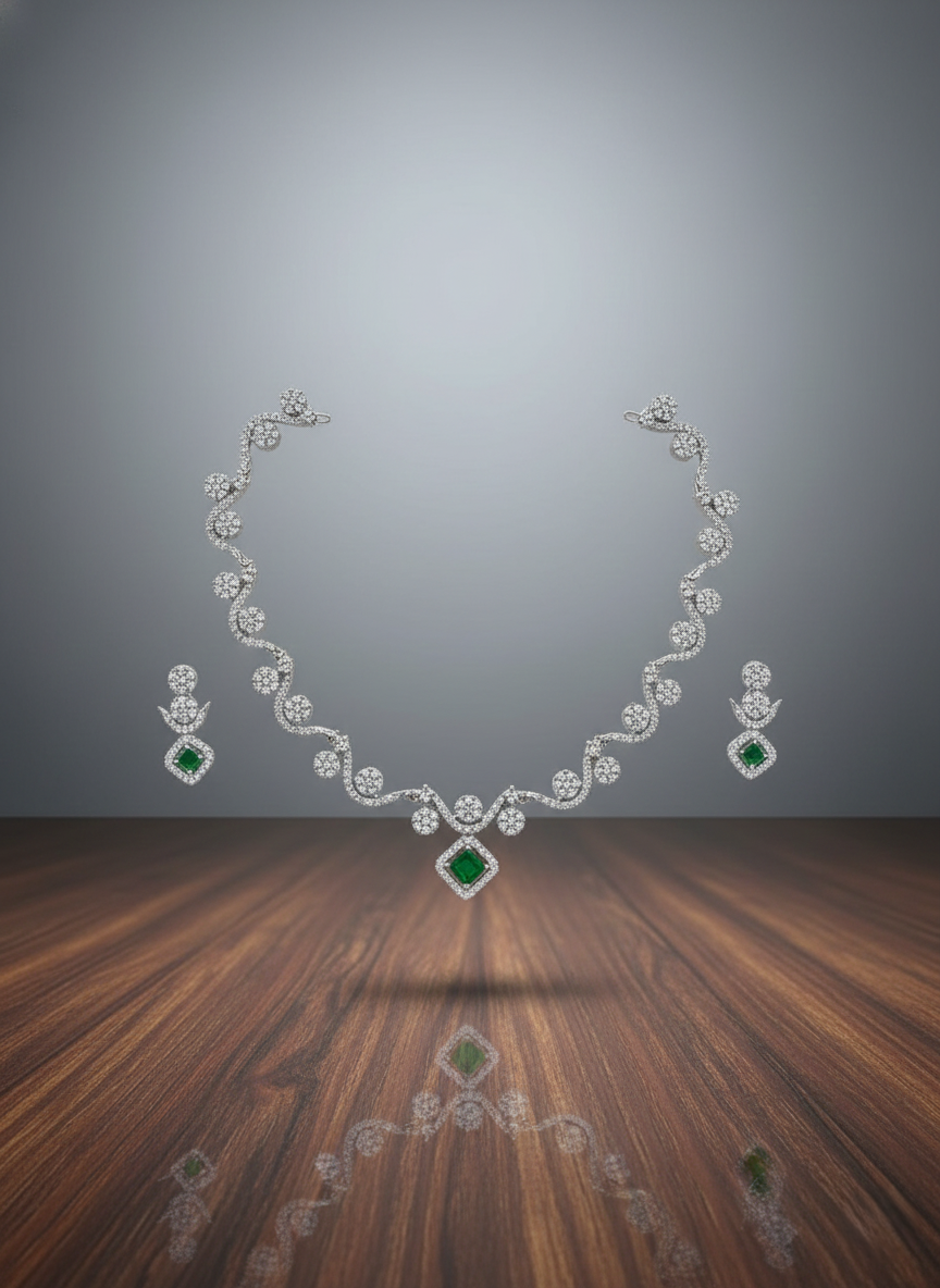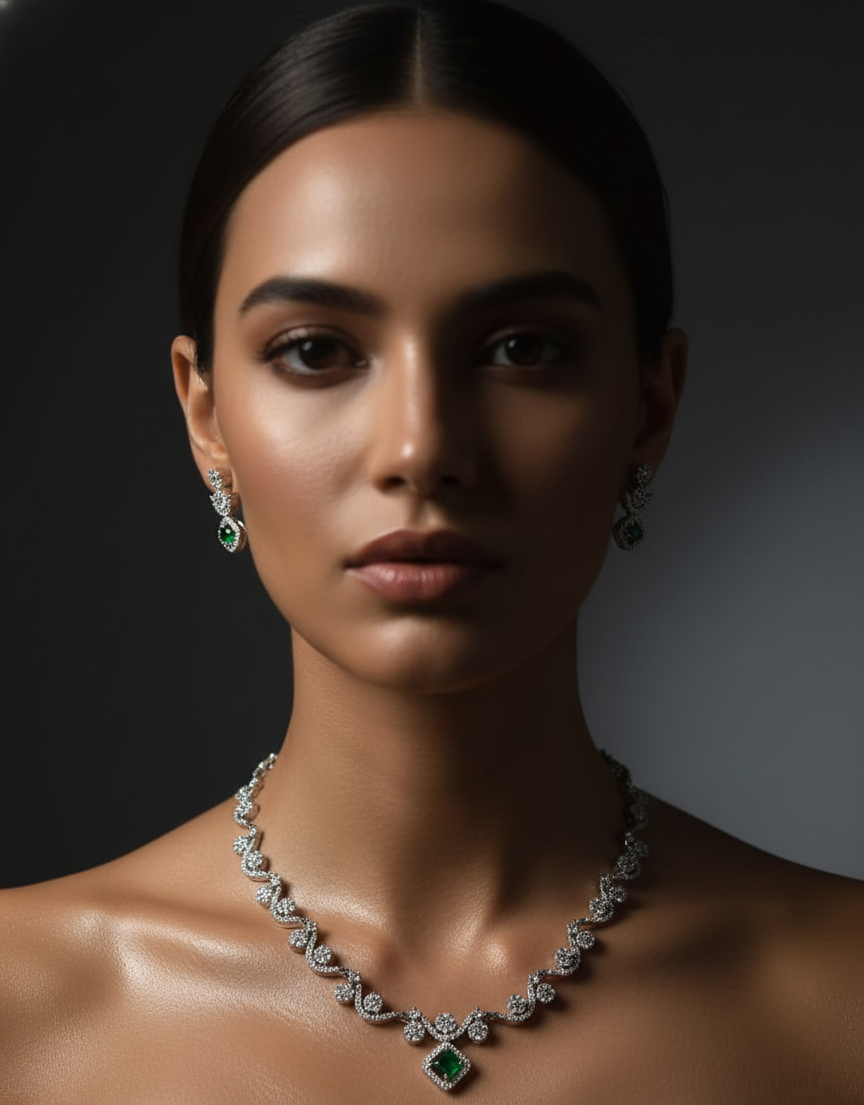 The Focal Point: At the heart of the necklace hangs a captivating square-cut emerald green stone, framed by a shimmering halo of pavé-set stones for a touch of royal elegance.