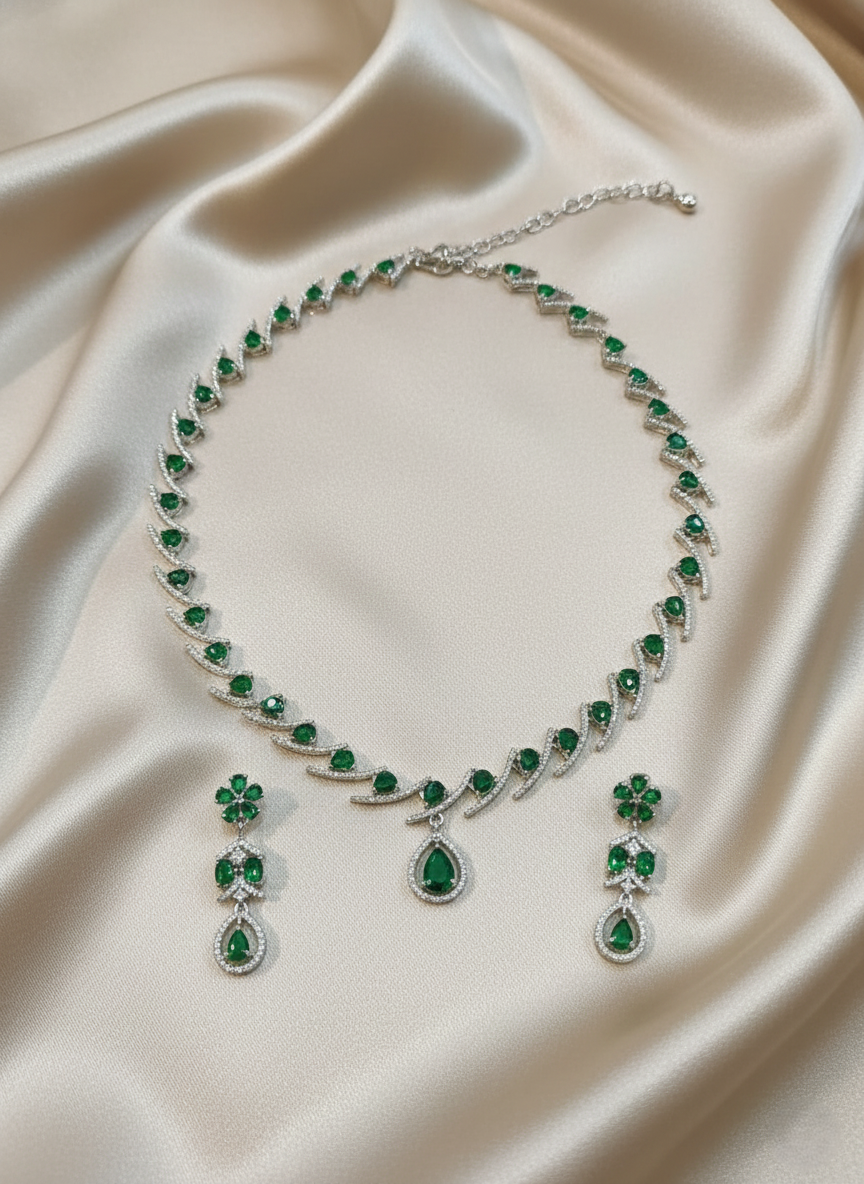 Elevate your evening ensemble with the timeless sophistication of the NISA Necklace and Earring Set. Featuring a radiant combination of brilliant-cut American Diamonds (AD) and vibrant emerald-green stones, this set is designed for the woman who loves to make a refined statement.