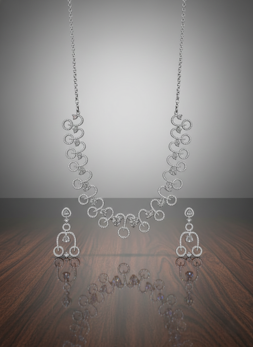 Elevate your evening ensemble with the breathtaking Nisa Necklace Set, a masterpiece of contemporary jewelry design. Crafted for the modern woman who appreciates classic brilliance, this set features a fluid, scalloped silhouette that mimics the graceful curves of a blooming vine.