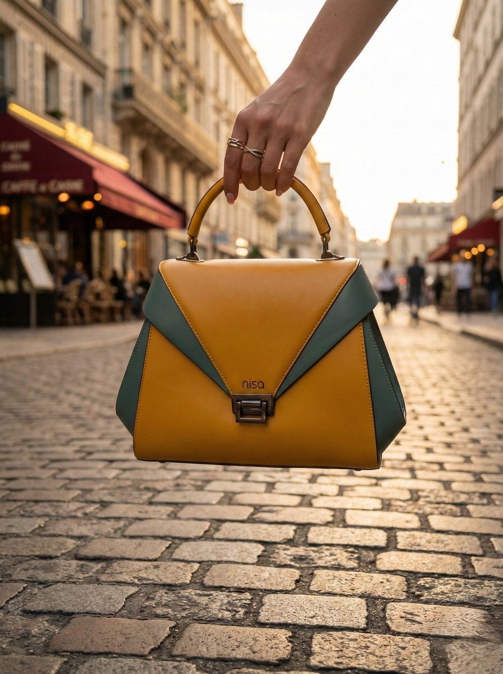 Elevate your daily ensemble with the stunning Nisa Satchel. This structured handbag features a bold, modern silhouette defined by its striking color-block design. The warm mustard yellow body is perfectly contoured by deep teal accents, creating a sophisticated geometric V-shape flap that draws the eye.