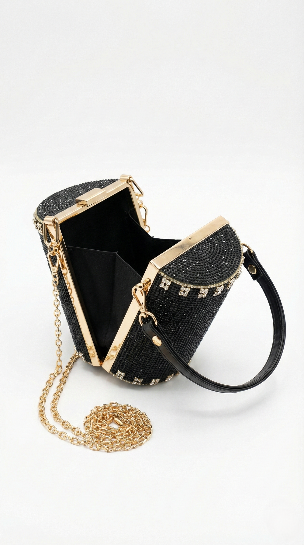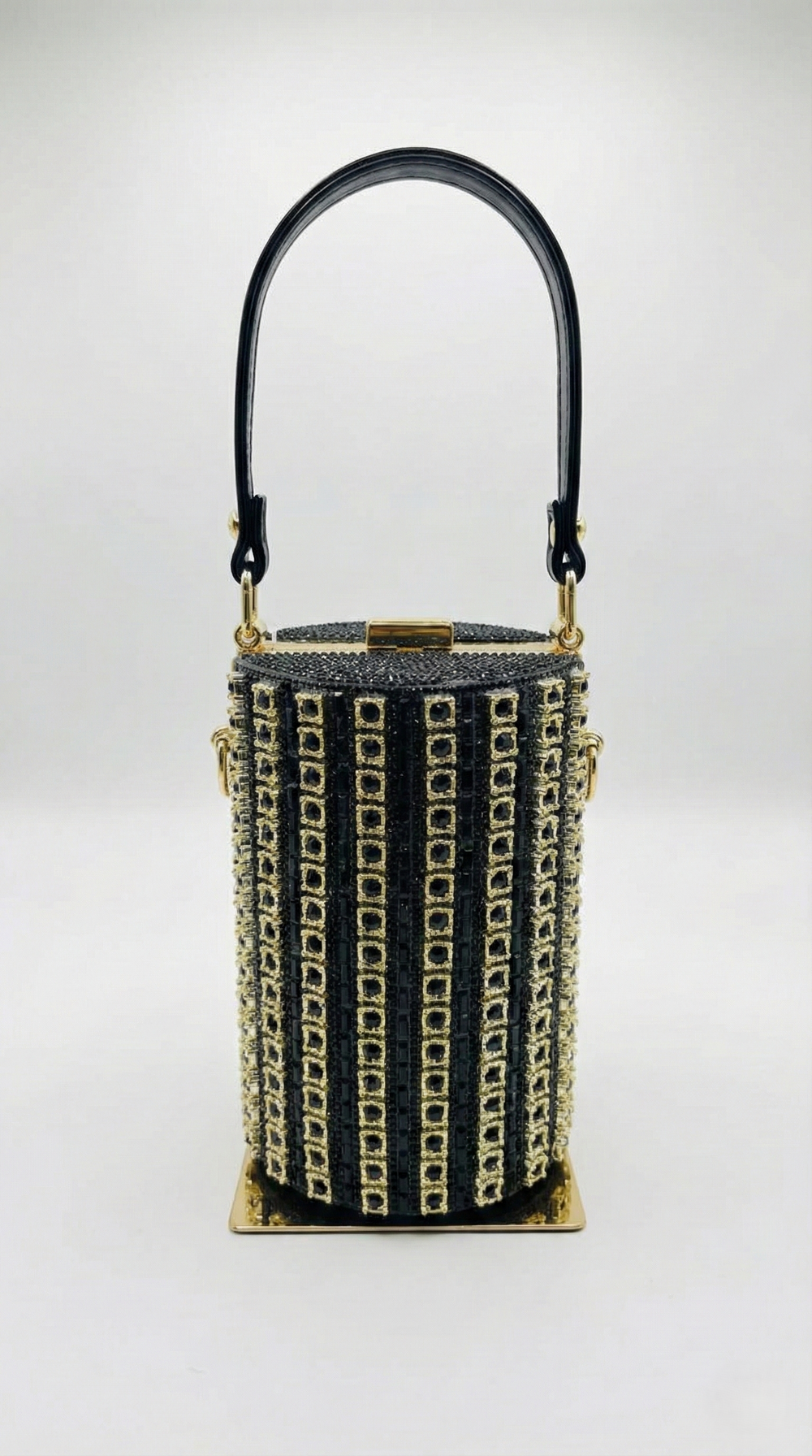 Elevate your evening ensemble with a touch of architectural elegance. This exquisite cylindrical evening bag is a masterpiece of contrast and sparkle, designed for the woman who isn't afraid to shine.