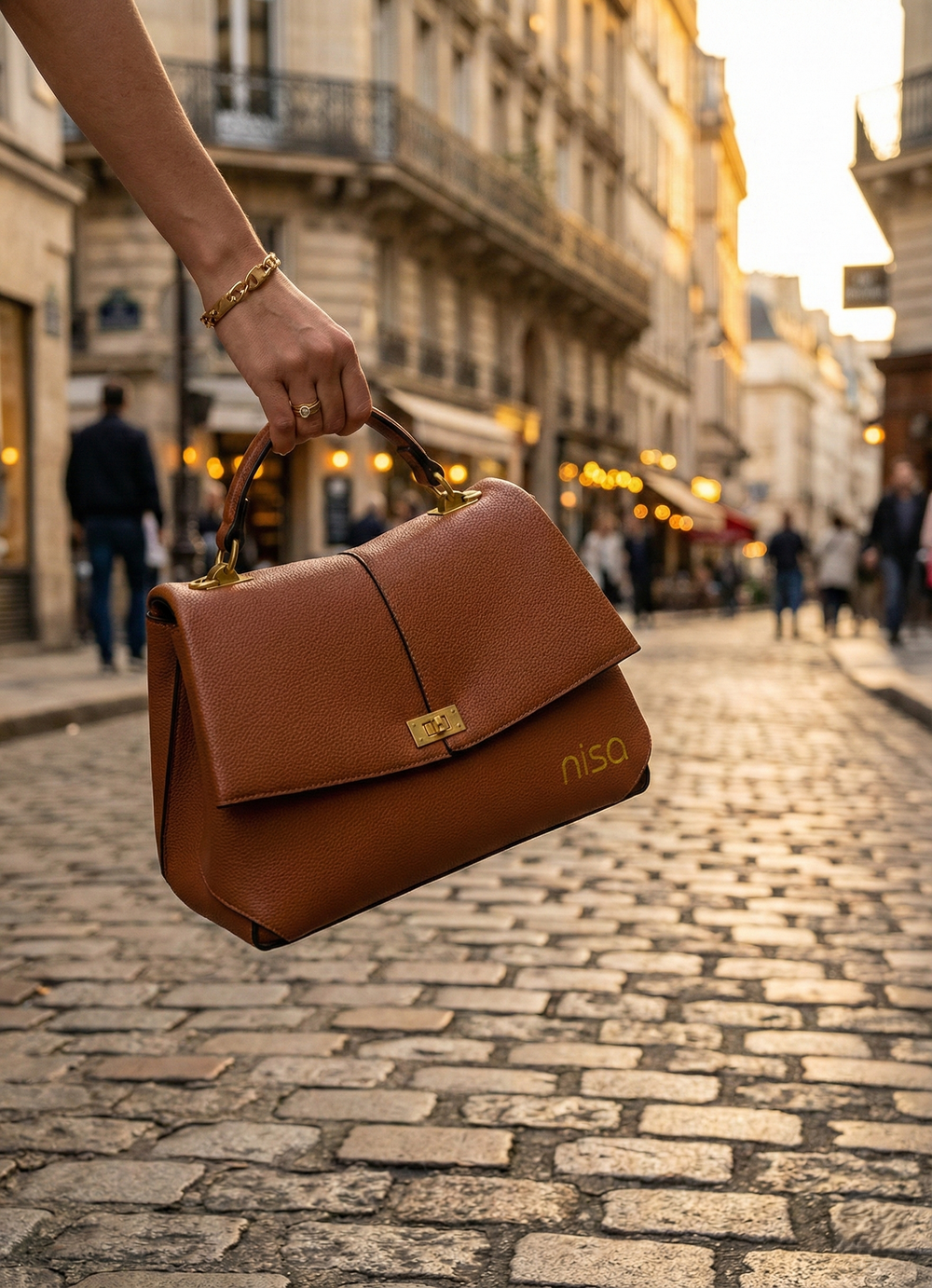 The silhouette features a refined top handle for a classic carry, while the gold-tone turn-lock closure adds a flash of luxury to the front flap. Need to go hands-free? Simply attach the matching adjustable strap to transform it into a chic shoulder or crossbody bag. Finished with the distinct "nisa" gold branding, this is more than a bag—it's a statement of poised style.