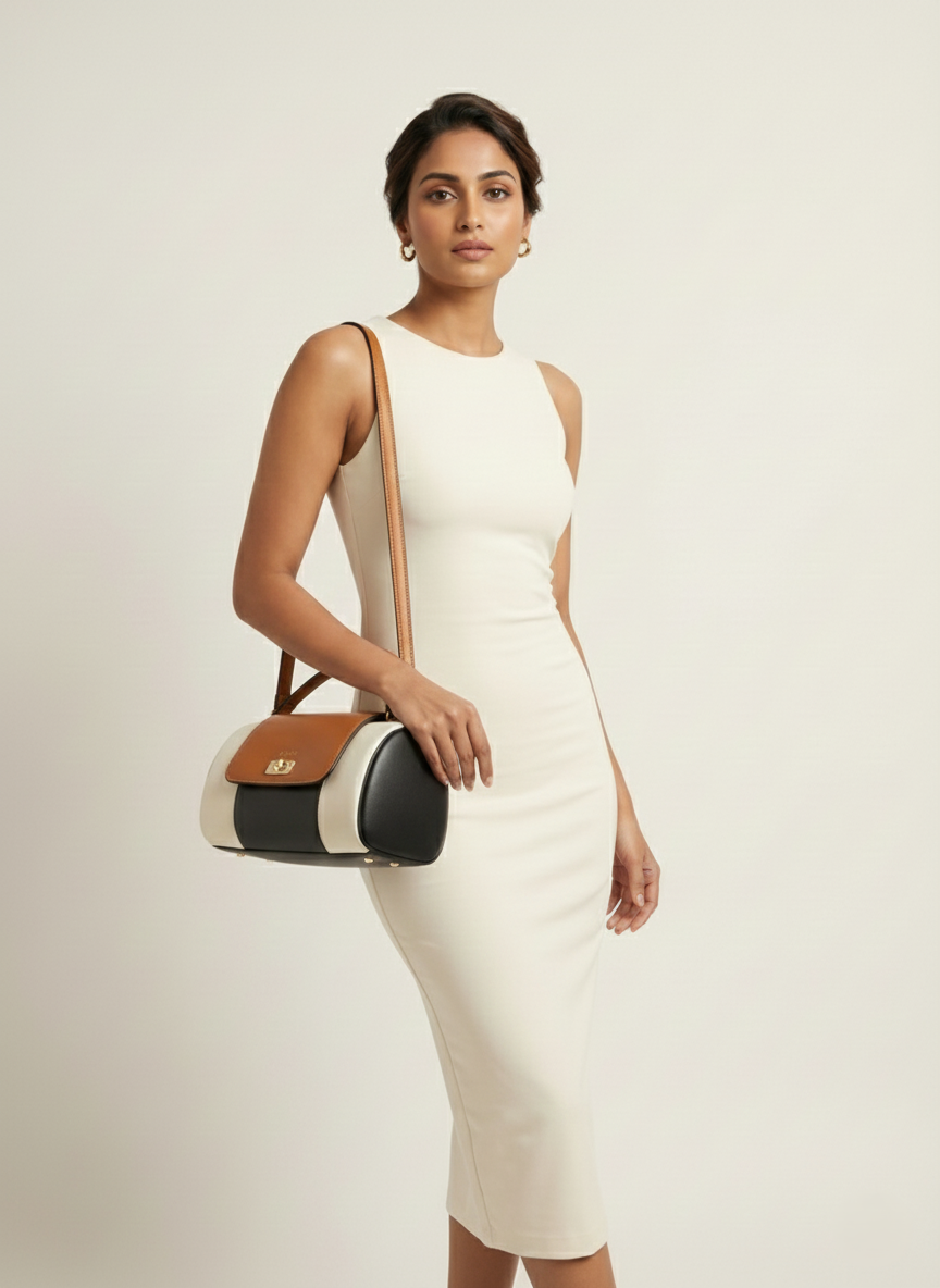 Elevate your everyday look with the Nisa Tri-Tone Barrel Bag, a masterpiece of modern structure and classic color blocking. Designed for the woman on the go, this sophisticated handbag features a chic cylindrical silhouette that blends creamy white sides with a rich cognac brown flap and a bold black base.
