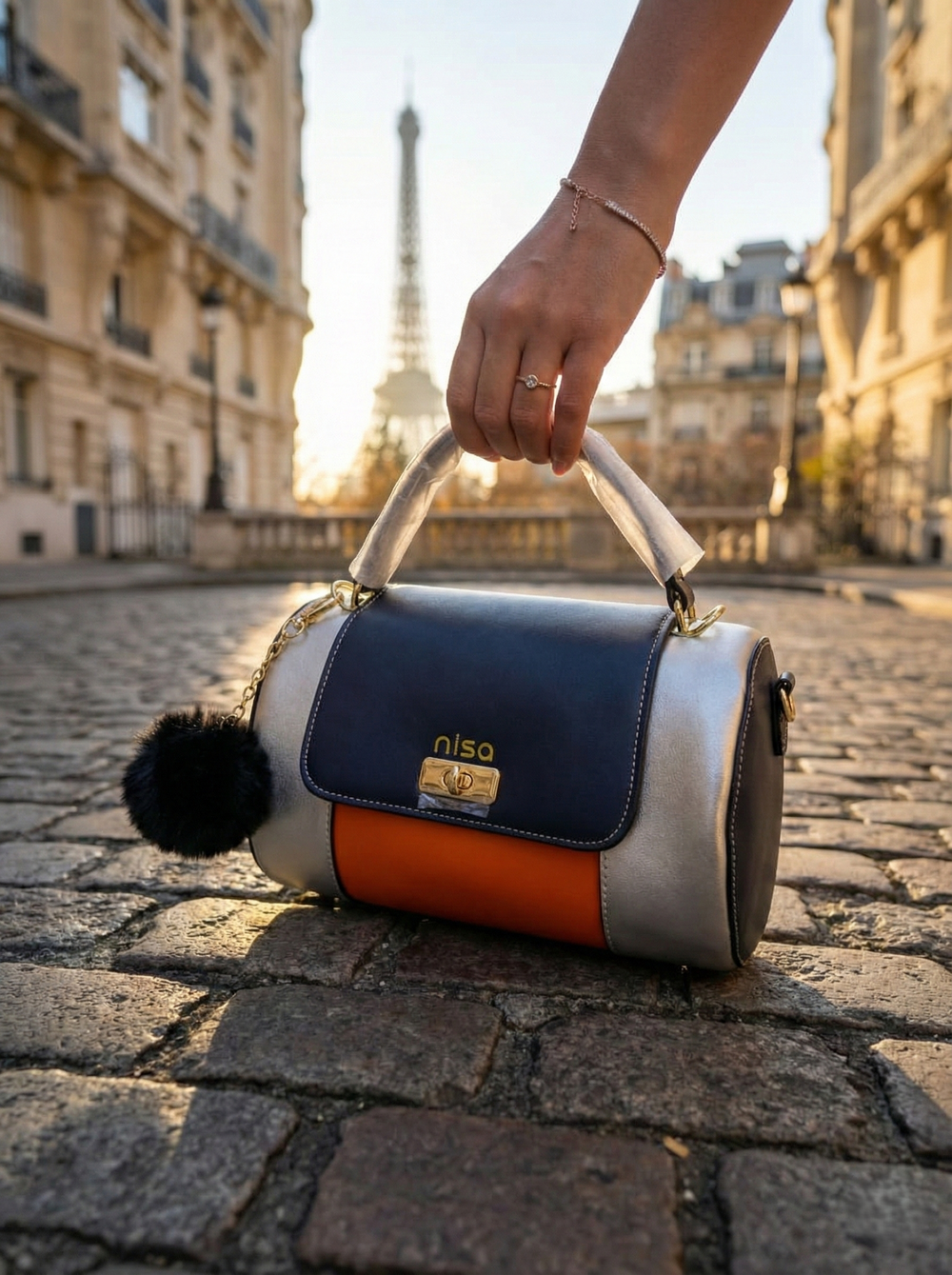 Description: Make a bold statement with this structured satchel by Nisa. Designed for the modern trendsetter, this bag features a striking color-block design that combines a classic deep navy flap, shimmering silver textured sides, and a vibrant burnt orange base.