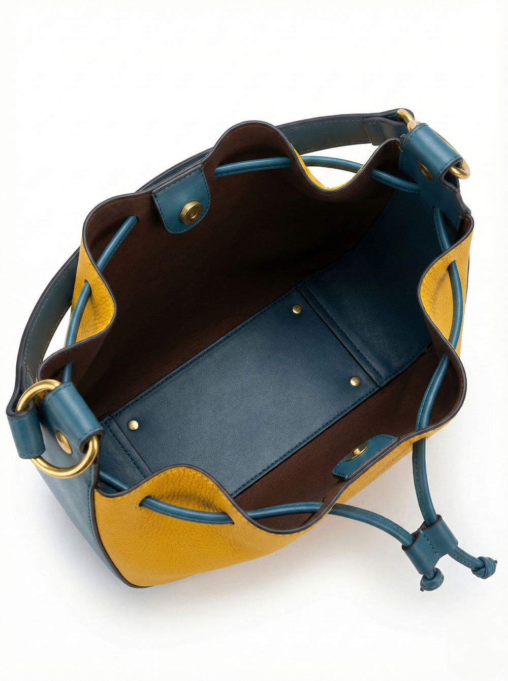 Hobo Handbag: The main bag features a relaxed, slouchy silhouette in vibrant yellow leather, beautifully accented by a rich teal leather top handle and drawstring closure. Gold-tone hardware and the embossed "nisa" logo add elegant touches.