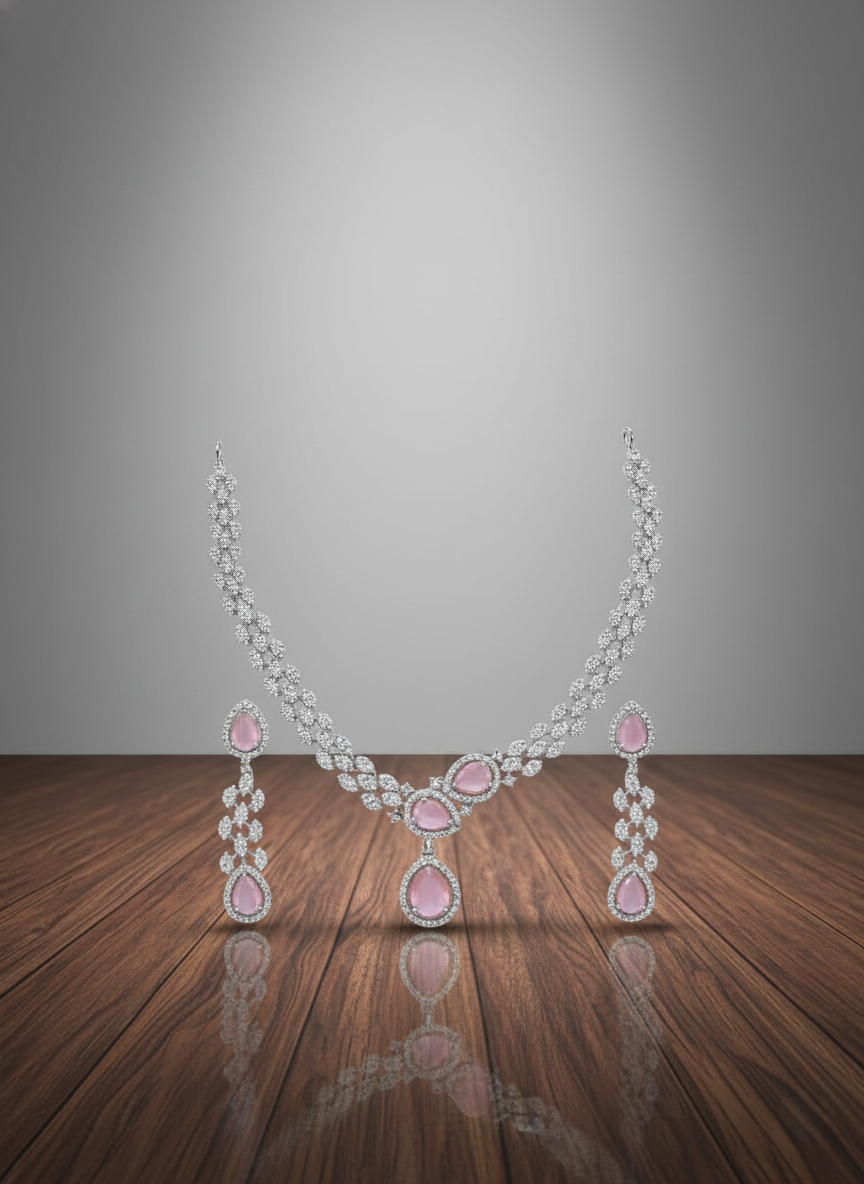 Elevate your elegance with this stunning American Diamond necklace and earring set. Featuring a delicate double-strand design and soft pink teardrop stones, this set is the perfect blend of contemporary sophistication and timeless charm. Whether you are attending a wedding, a gala, or an intimate dinner, this set adds a subtle pop of color and a brilliant sparkle to your ensemble.