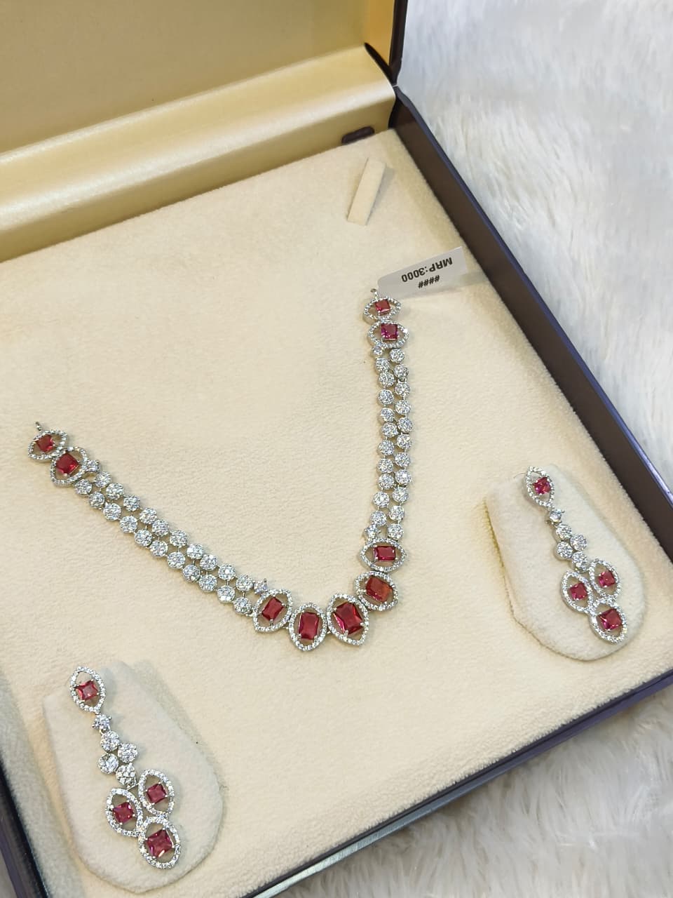 Design: A contemporary dual-strand necklace featuring brilliant-cut American Diamonds (AD) that lead to a striking center focal point of rectangular, ruby-red synthetic stones.