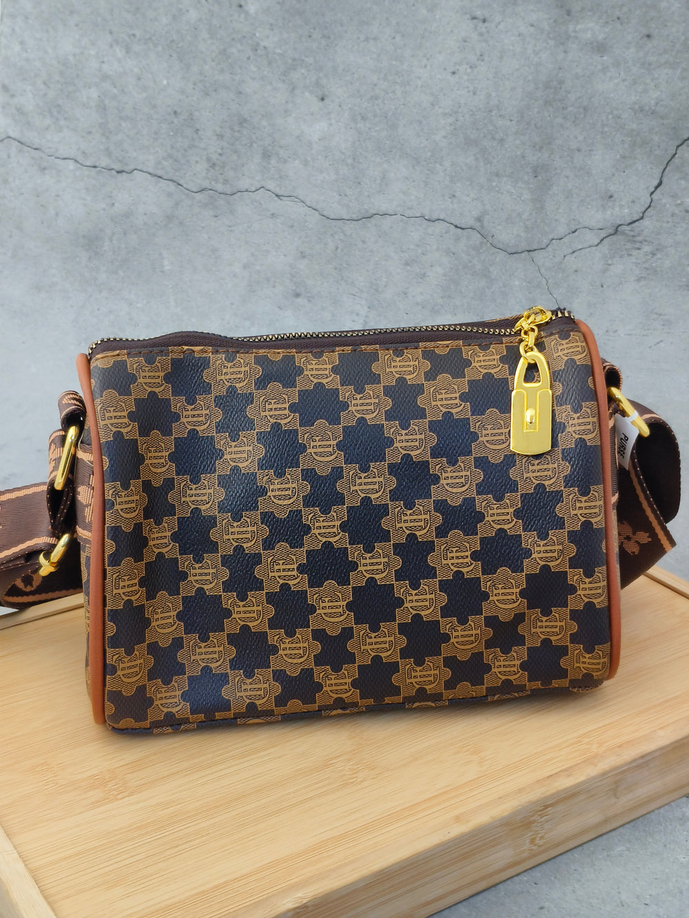 Elevate your everyday style with this chic and versatile crossbody bag. Crafted from premium-quality vegan leather, the bag features a timeless monogram pattern with elegant gold-tone hardware. The adjustable shoulder strap allows for a comfortable fit, while the compact yet spacious interior keeps your essentials organized and within easy reach.