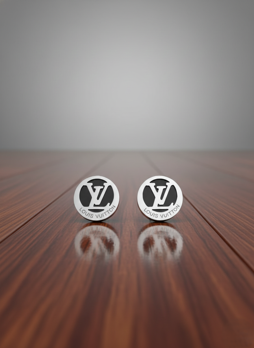 Elevate your everyday style with these stunning Stainless Steel Stud Earrings. Featuring a sophisticated circular design, each earring showcases a glossy black surface intricately patterned with silver, monogram-inspired motifs.